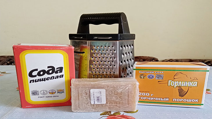 Средство для мытья посуды с использованием соды, горчицы и нашатырного спирта. Для него понадобиться: