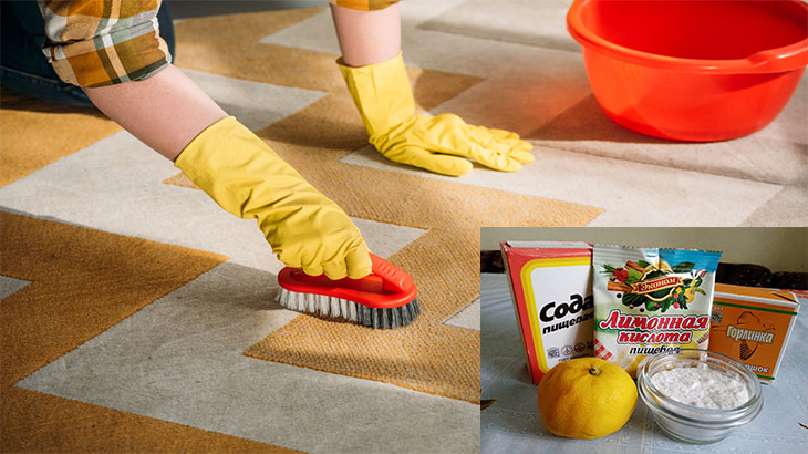 Для очистки ковров и паласов используют смесь из соды и эфирного масла. На 200г. соды добавляют 5-10 капель эфирного масла. Все перемешивают и тонким слоем распределяют по ковру или паласу. Оставляют на 10-12 часов. По прошествии времени чистят жесткой щеткой и пылесосят. Эта смесь помогает не только очистить ковер но и устраняет не приятные запахи.