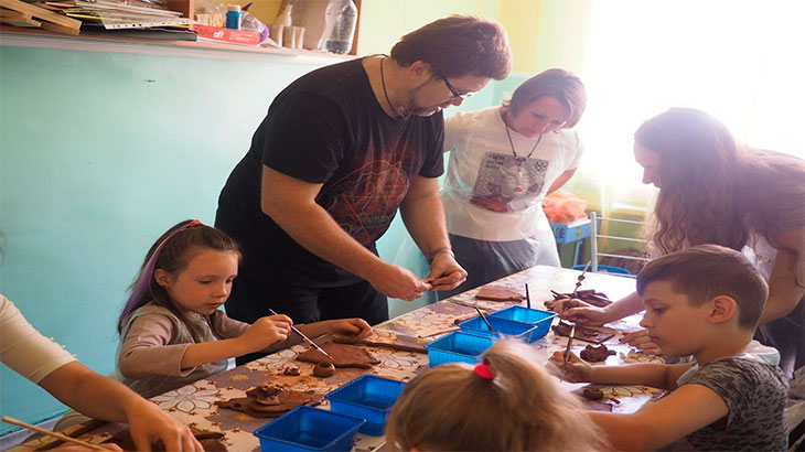 В керамической мастерской преподает бывший журналист, а ныне гончарный мастер Анатолий Панфилов. В работе с детьми происходит, некое взаимотворчество. Ребенку всегда все интересно, особенно если учитель много знает и умеет. Особенную радость приносит, когда у ребенка начинает получаться то что он делает. Но важно и другое. Контакт с глиной, активная работа пальчиками улучшает психо-физическое состояние ребенка, способствует его адаптации в коллективе, повышает способность усваивать материал. В процессе лепки работа с мелкими деталями требует, усидчивости, аккуратности, внимания. При этом активизируются самые маленькие мышцы рук, они развивают моторику, тем самым влияют на развитие ребенка.