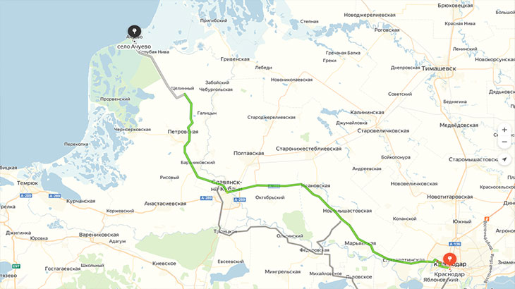 Дальше двигаемся до Славянска-на-Кубани. Проезжаем через Трудобеликово и касаясь окраины Славянска движемся в село Ачуево, по пути проезжая следующие поселения: станица Петровская (остается слева), хутор Беликово (слева), поселок Целинный (справа), поселок Голубая Нива (справа). Далее на село Ачуево. Не забывая при этом заправиться на заправке в хуторе Беликово, так как это будет последняя заправка на пути в Ачуево.